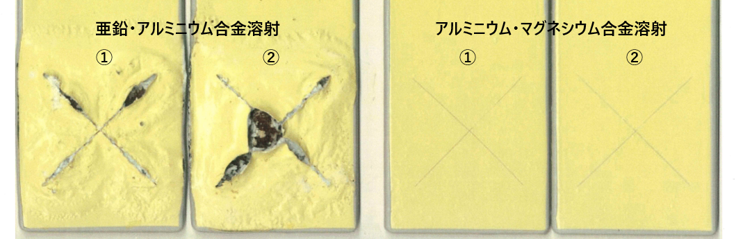 当社が所属する防食溶射協同組合の複合サイクル試験(塩水噴霧・湿潤・乾燥の繰り返し)では、次のような結果が確認されています。